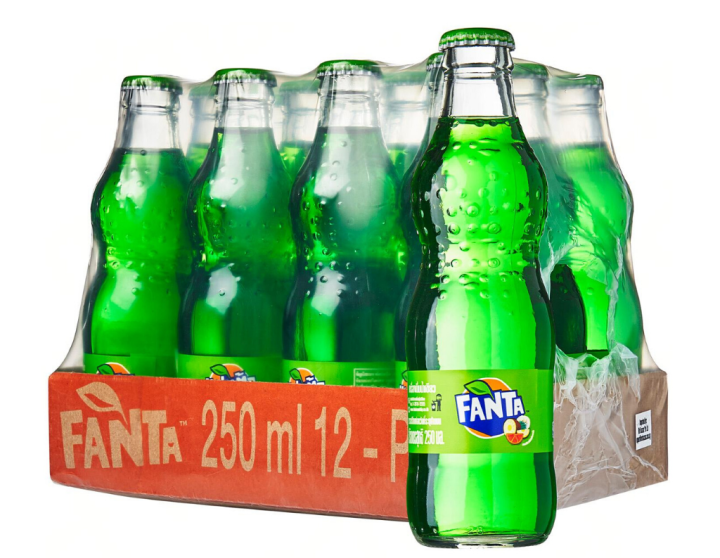 Unique Fanta Green Soda in glass bottles, pack of 12.